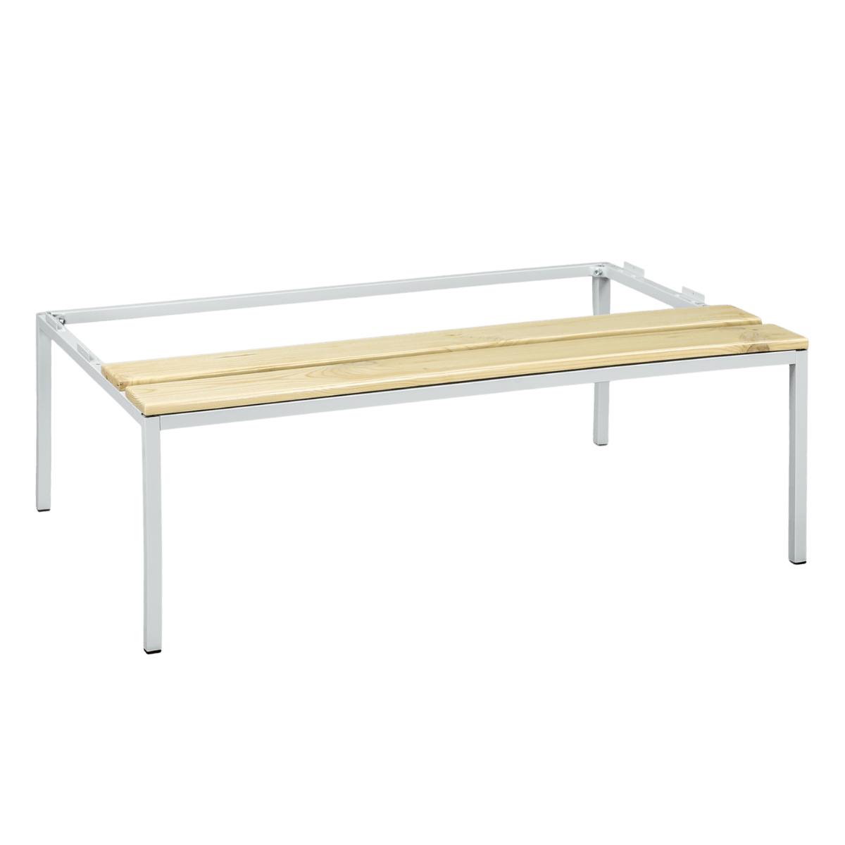 Praktisk sittbänk med två sittbrädor i massiv furu, anpassad för klädskåp med två dörrar. Skåpet monteras bakom brädorna och fästs enkelt med medföljande skruvsats. Underrede i lackerat ljusgrått utförande ger en slitstark och lättskött lösning för omklädningsrum, personalutrymmen och industriella miljöer.