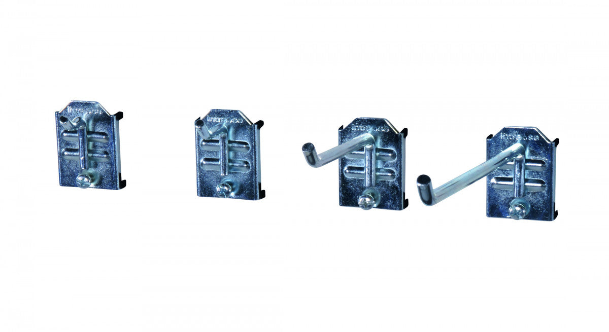 Upphängningskrok för bl.a. handverktyg. Förzinkad. Kroken passar perforerade paneler, där den hakas i plåtens perforering och låses med stoppskruv.